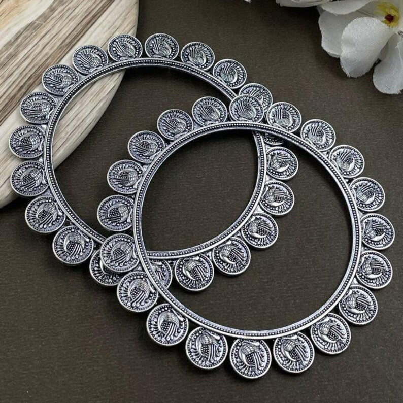 STANDARD SIZE 2.5 INCH DIAMETER. (DHAI SIZE)  Enhance your style with our PEACOCK BANGLES. These oxidised bangles are adorned with intricate peacock designs, adding a unique and elegant touch to any outfit.